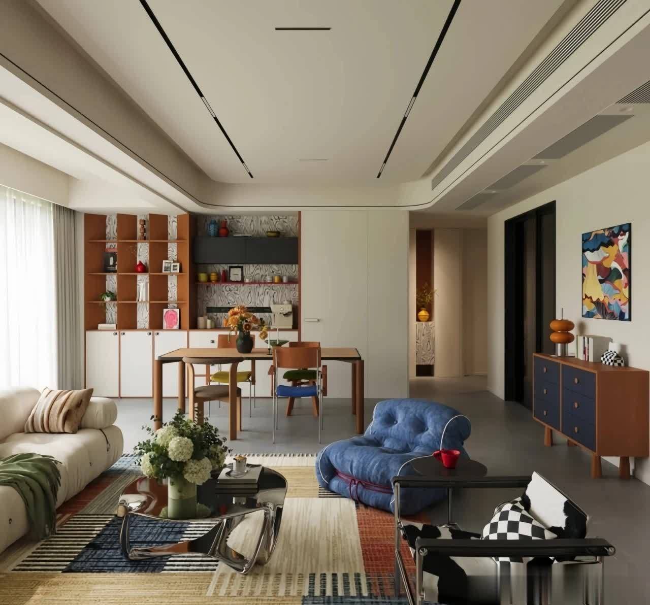 这类元素无需大面积运用,小面积点缀就能达到亮眼效果,还能避免视觉杂乱。客厅的沙发上,摆上几款带条纹、波点图案的抱枕,简约中多了几分俏皮;茶几下方铺一张几何格纹地毯,既能划分空间区域,又能丰富视觉层次;休闲角的单人椅选带有简约线条设计的款式,或是在墙面挂一幅几何装饰画,角落的置物架搭配几何造型摆件,细微之处的巧思,能让空间瞬间摆脱沉闷,变得鲜活又有个性。