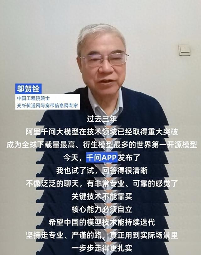 在亲身体验后,邬贺铨院士对千问APP的专业能力给予了高度肯定,称其“对科研问题理解到位、回答专业,有耳目一新的感觉”。他希望中国的模型技术能够坚持走专业严谨的路线,持续迭代,并真正把模型能力应用到实际场景中去。
