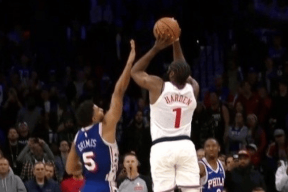 比赛最后时刻,哈登出手三分被格兰姆斯点肘,裁判未吹罚犯规。