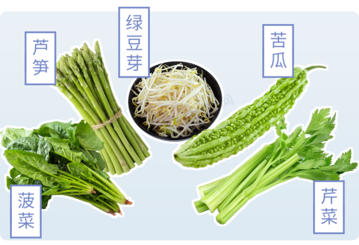 并且要注意和其他蔬菜搭配、轮换食用,以保证营养全面均衡,比如这些食材,也有降肝火功效,大家可以自由搭配组合。